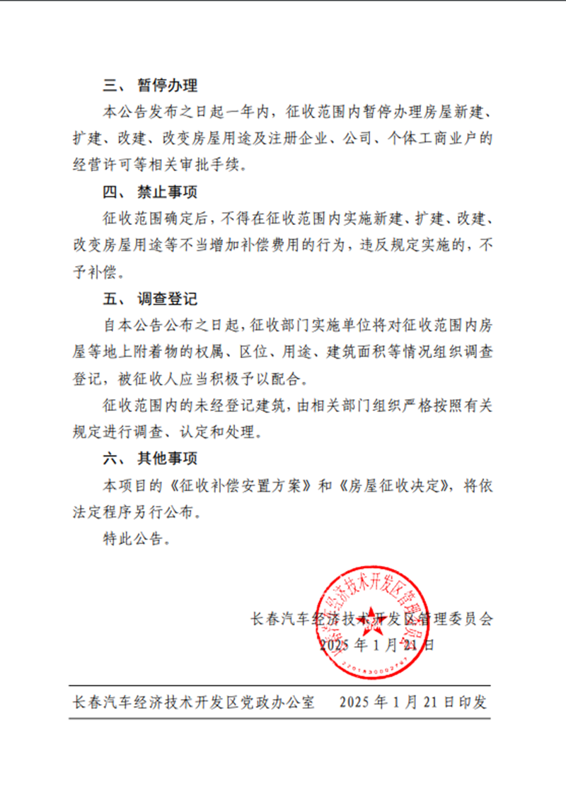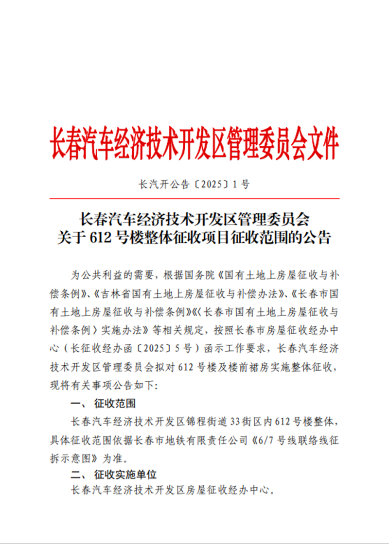 长春汽车经济技术开发区管理委员会关于612号楼整体征收项目征收范围的公告