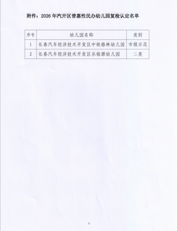 关于2026年汽开区普惠性民办幼儿园复检认定名单的通知